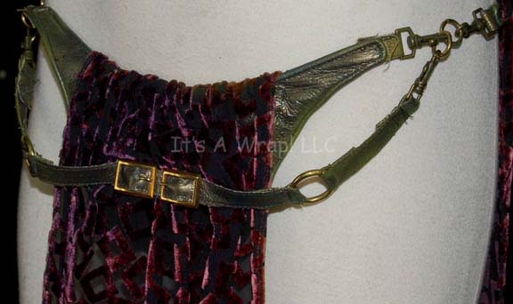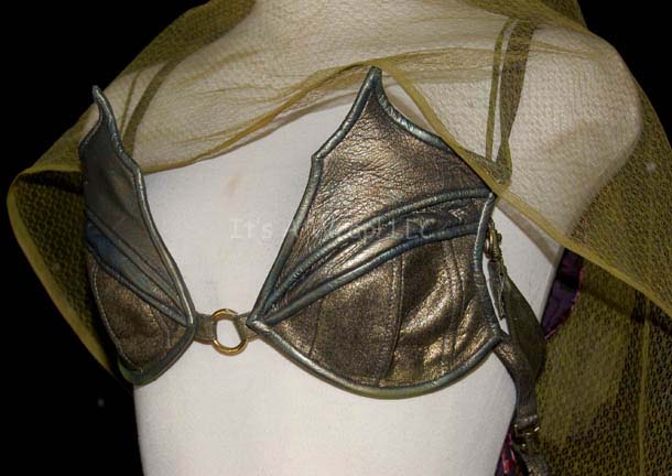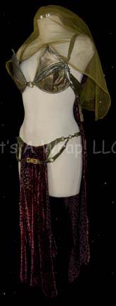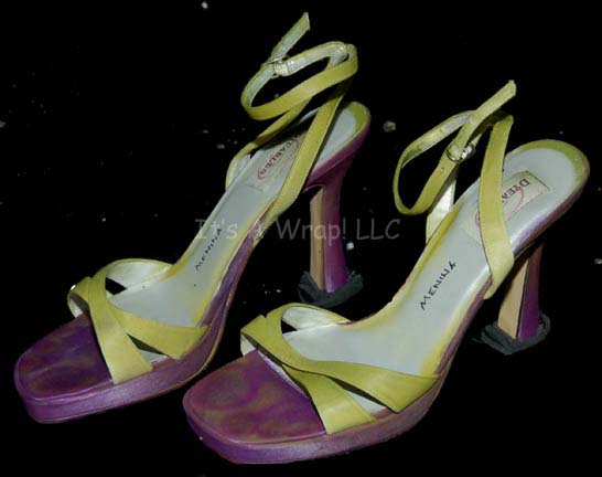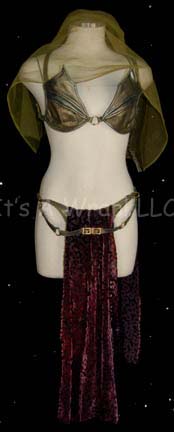 Description: STAR TREK: ENT “ORION SLAVE GIRL MARAS COSTUME” FROM “BOUND” A costume featured in the Star Trek: Enterprise episode “Bound”; wherein “Captain Archer” (Scott Bakula) receives a gift of three Orion slave girls as a gift from a treacherous Orion merchant with plans to collect the bounty on his head. This costume is for wear by Menina Fortunato in the role of the Orion slave girl “Maras”; it is a green leather bikini with a sheer, black drape featuring a design of embossed, purple velvet squares, olive green netting, and matching, green and purple, four-inch, high heels. A costumer’s tag reads ‘Bound #093, Maras, Menina Fortunato’.
