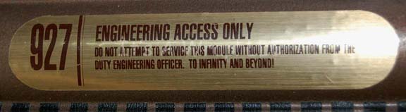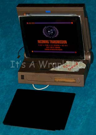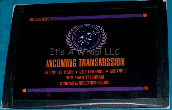 Description: A damaged ‘computer’ prop located in its current condition believed to have appeared in a Star Trek feature film starring the Next Generation cast. The item is made from molded resin with two acrylic ‘display screens’, one smoked, the other opaque white with a graphical application adhered to it. The item is missing its base bottom and part of the reverse which serve as a battery cover. Untested interior electronics are still present as are lighting positions for the screen, the item is believed to be powered by a Makita name brand battery, speculation comes on good authority as the item is similar to one sold in a previous auction. The screen features a graphic of the logo of the United Federation of Planets and reads ‘LCARS 40280 Incoming Transmission To: Capt. J.L. Picard – USS Enterprise – NCC 1701 E, From Starfleet Command, Command Authorization Required’. The monitor itself features a metallic gold colored Starfleet inventory application and the base is partially obscured by a prop tag of adhesive masking tape inscribed ‘No Good’. The item measures approx. 9.75 X 10.25 X 6 inches.
