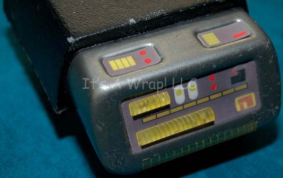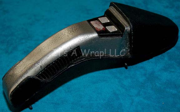 Description: A pair of props featured variously in Star Trek episodic television for use by characters in Starfleet or the Federation, a tricorder and phaser, both molded into holsters. The items are intended to appear as though they can be removed and used, but were not the hero props for the episode in which they appeared. The tricorder is made from molded rubber with yellow tinted acrylic accents, painted metallic silver, and adorned with graphical applications to suggest hardware, it is part of the holster which features sturdy metal wire backs to fit into ‘away team’ gear loops on costume uniforms (sold separately). The phaser is made from molded foam rubber, painted metallic silver with similarly painted faux buttons, the holster also features the same style of wire backs for costumes. The items measure approx. 4 X 3e.25 X 2 inches and 7.75 X 2.25 X 2.25 inches respectively.