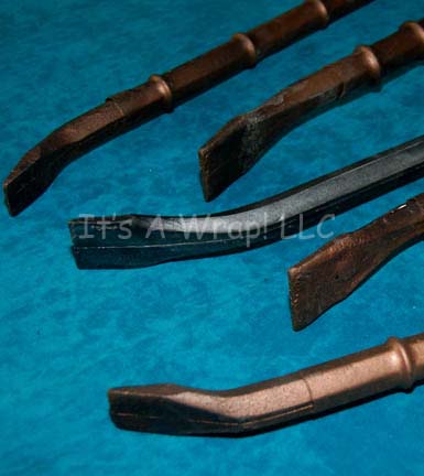 Description: A lot of two prop Klingon knives featured in the Star Trek: Enterprise series. They were made to be non-descript background props and therefore the knife and holder are made as one piece entirely of foam rubber. The knife and holder are painted black and feature rust-colored, textured detail and the spiked ball accents seen on later Klingon knives. On the side are two brass metal butterfly clips for attaching the knife to belt holes. Measures approx. 13 ½ x 3 x 1 inches.