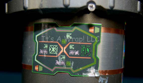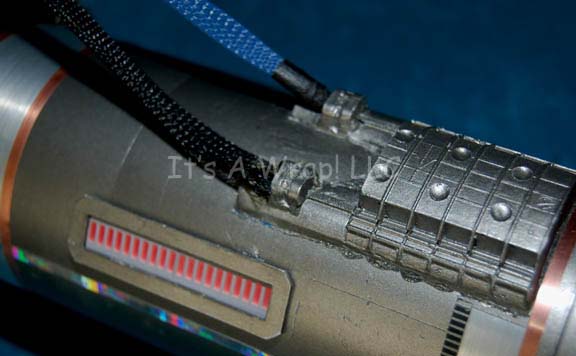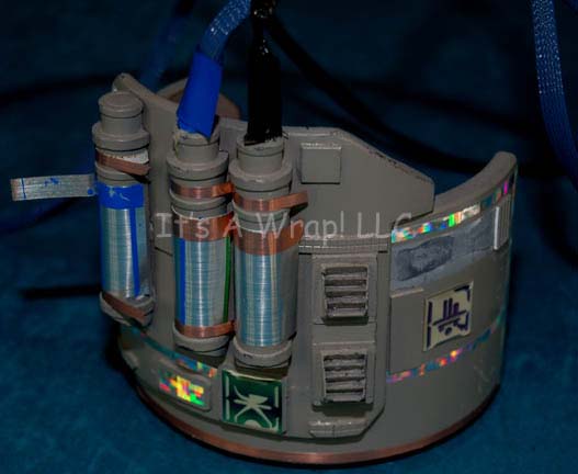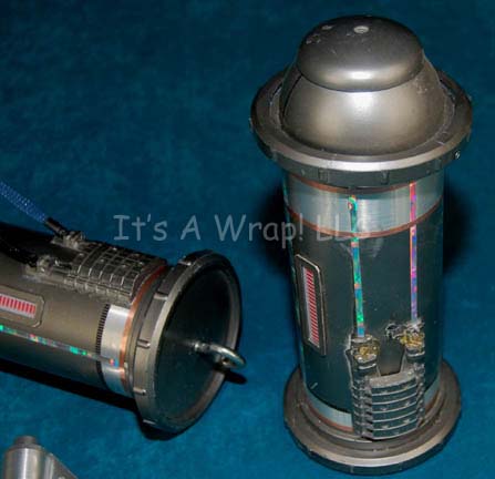 Description: A Lot of three Reman injection needles created for Star Trek X: Nemesis in the scene in which “Captain Picard” (Patrick Stewart) is transported aboard the “Scimitar” and held hostage by “Shinzon” (Tom Hardy). The items are metallic silver painted fashioned plastic and wood hand props with black adhesive detail lines. The items are also adorned with metallic silver colored adhesive accents and measure approx. 7 X 4 X 1.25 inches. The lot also contains a prop hanging intravenous fluid supply made from cast resin painted metallic pewter with metallic copper and silver colored adhesive accents, a hook to hang the item, connected to an arm cuff by blue and black colored rope. The cuff is similarly adorned but includes a miniature ‘display screen’ graphic adhered to it, and Reman style faux buttons. The supply also features an LED bank that blinks red in sequence, activated by a switch and powered by a 3volt CR 2032 sized battery. The item measures approx. 10.5 X 4 inches diameter, with the cuff measuring approx. 4.25 X 4.25 inches.