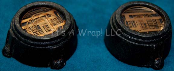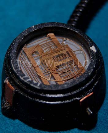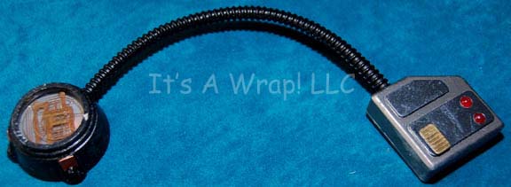 Description: A prop item featured in the Star Trek: Voyager episode “Mortal Coil”; wherein “Neelix” (Ethan Phillips) dies, is revived and starts to question his beliefs about death and what comes after. This item is a medical device placed on “Neelix’s” face while “The Doctor” (Robert Picardo) is trying to revive him in sickbay; it features a gray trapezoidal piece with darker gray accents, a gold-colored button that activates two blinking red lights. A black, plastic tube attaches it to a black round device with gold colored “circuitry” in the middle, two blinking yellow-orange lights that still retain power from production, an activator switch on the side, and three similar prop pieces that do not light up. The item measures approx. 9 X 3 inches.