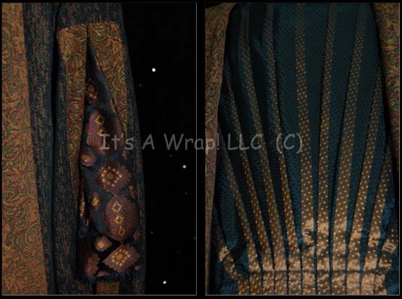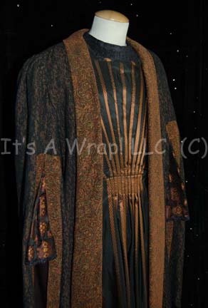 Description: A “Garos” stunt costume featured in the Star Trek: Enterprise episode “Civilization”. Happening upon a world with a society in a renaissance, the “Enterprise NX-01” crew visits undercover and finds another alien race mining the world with dangerous complications. The costume is an elaborate affair with purple form fitting trousers, a black frock with iridescent copper colored stripes and floral diamond patterned sleeves with frilly trim at the cuffs, and a thick texture patterned fabric robe with black interior lining. The robe is collared with pleated shoulders and snaps to seal it. The costumer’s tag reads ‘Enterprise #009 “Civilization” , Garos stunt dbl., Vince Deadrick, Jr.’.