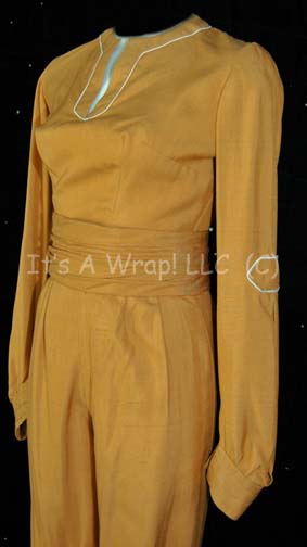 Description: A “Dr. Carol Marcus” (Bibi Besch) costume featured in Star Trek II: The Wrath of Khan. The costume is two sets of caramel colored trousers with reinforced ankle cuffs, a matching shirt with sleeve accents and pleats, a pair of shoes with thick soles and heels, and a researcher tabard cream colored with an asymmetrical zip and snap front and an affixed researcher badge with a faded orange resin detail and a circular inset suggesting hardware. The costumer’s tag on the tabard reads ‘Star Trek II 60180-100 Bibi Besch as Carol Marcus chg. #1, 3 of 3’ and the costumer’s tag with the trousers and shirt reads ‘Star Trek II 60180-100 Bibi Besch as Carol Marcus chg. #1, 2 of 2 ST WOK’. No sewn in tags are present. Two wide belts are present and one additional belt to which the fabric exterior has come undone. This lot comprises the last known “Dr. Carol Marcus” costume that has yet to be located.
