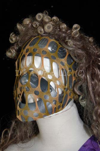 Description: A mask and wig combination featured during the Khitomer Conference sequence of the sixth Star Trek feature film, “The Undiscovered Country”; wherein the Klingon moon of Praxis explodes and the Empire cannot deal with the repercussions of this and afford their tremendous military budget so the Federation is approached for a possible end to 70 years of hostility but not everyone wants to see the fighting end. This lot consists of a mask and wig worn by one of the Khitomer attendees, the mask is dark-gray, molded plastic featuring various textured accents meant to emulate some kind of hardware or circuitry and a mustard-colored open mesh over it. Also included is a curly-haired wig in various shades of brown that falls long in the back and a purple conference sash.