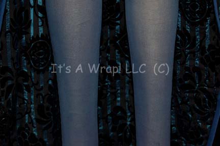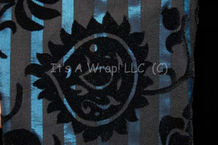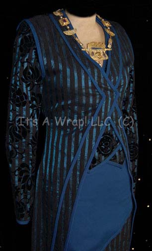 Description: A costume featured in the Star Trek: Deep Space Nine episode “Q-Less”; wherein Vash” (Jennifer Hetrick), unscrupulous archeologist and one time paramour of “Captain Picard” (Patrick Stewart) arrives on the station with “Q” (Jon DeLancie) not far behind and chaos ensues. This costume consists of a long-sleeved, black and metallic-blue striped under jacket featuring a texturing, velvet-like floral pattern, and non-metallic blue piping. A full-length, sleeveless, open robe-like garment that goes over the jacket and features the same vertical stripes but with a wrinkled look to the metallic-blue, more non-metallic blue piping down the front, the same floral pattern on the inside, a skirt the color of the piping inset with the same striped motif as the other two garments, matching blue leggings, and a piece of gold-colored metal necklace with faux jewels, faux pearls and the face of a cat on the largest piece. All three items feature sewn in Star Trek: TNG tags that read ‘Jennifer Hetrick’, all three also have “DS9” written on the tag as well; an additional costumer’s tag reads ‘407 DS9 Q-Less, Vash, Jennifer Hetrick’.