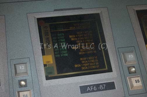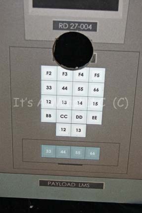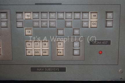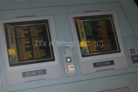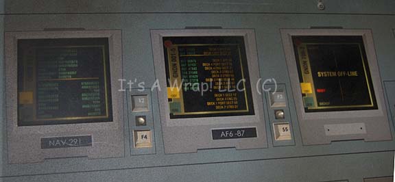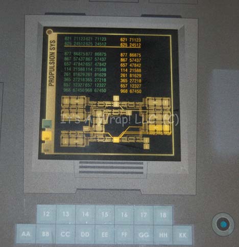 Description: A piece of set dressing similar to those featured in the Star Trek: Enterprise episodes “Horizon” and “Terra Prime”. Made in a style by which it would exist by ‘human' standards, it also could be used in civilian and Non-Starfleet settings. This board is high density foam core with a graphical application on top and is divided into three major areas’ the first area is labeled “Payload LMS” and “LS MEMSYS”, is dominated by two larger backlit acrylic panels and one smaller one with graphical applications applied to the reverse featuring data concerning “Propulsion Systems” in addition to several banks of faux buttons and a round hole just under the smaller screen. The second area runs along the top of the right half of the console and features four smaller backlit acrylic panels with similar graphical applications applied to the reverse all four coupled with a bank of two rubber faux buttons and with labels like “NAV-291” and “F2 CNTRL” beneath them. The last portion is beneath the bank of smaller screens and features two large banks of rubber, faux buttons with labels under them like “NAV SUBSYSYS” and “AUX PWR”. The item measures approx. 67 X 17 inches