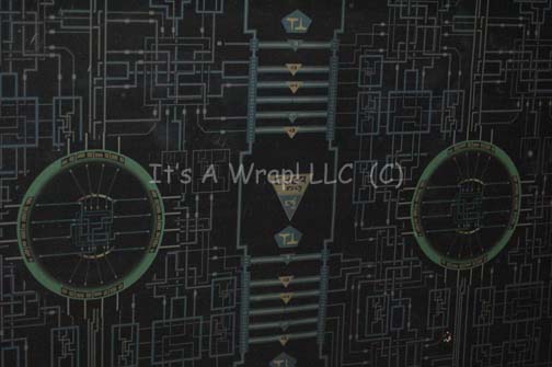 Description: A piece of set dressing believed to have been featured in the Star Trek: Enterprise episode “Babel One”; wherein the “Enterprise NX-01” takes a Tellarite ambassador to a conference on Babel, rescues a besieged “Shran” (Jeffrey Combs) from a mysterious ship that can look like seemingly anything. This item is a rectangular piece of smoked acrylic featuring a graphical application adhered to the reverse of two large interwoven circuit paths with large central nuclei, various shapes and Romulan iconographic symbols. The item measures approx. 38 X 31 inches.