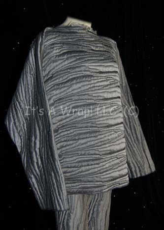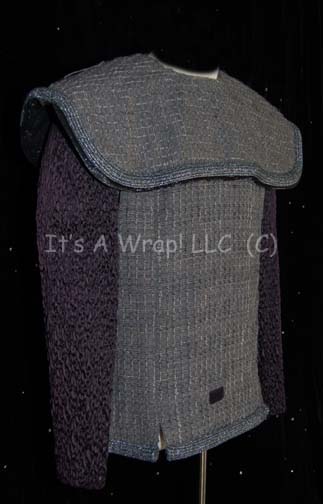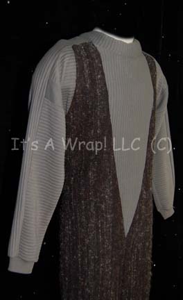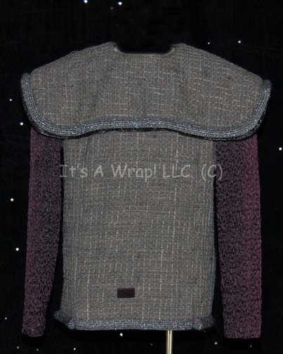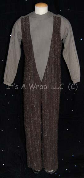 Description: A costume lot similar to those featured in various episodes of the Star Trek: The Next Generation. The first costume is a long-sleeved, full-length gray jumpsuit consisting of a textured, ribbed, sweater sewn onto black boucle trousers with uneven white stripes from the episode “We’ll Always Have Paris”. The second costume is a long-sleeved shirt featuring a silver, gray, and black “wood” pattern in horizontal stripes and in vertical stripes for the trousers. The collar of the costume appears to have been cut out or unfinished and is featured in the episode “Where None Have Gone Before”. The third costume is a gray uniform top patterned with padded silver sparkle trim around the shoulders and waist, and black crinkle fabric sleeves from the episode “Heart of Glory” The first costume includes a sewn in Star Trek VII tag that reads ‘David Weaver’ and a costumer’s tag that reads ‘124 We’ll Always Paris, Man on the phone’; the second costume has no sewn in tag but has a costumer’s tag that reads ‘The Traveler, Eric Menyuk , Where None Have Gone Before, Top and Pants, Don’t know if used’, and the third has a sewn in Deep Space Nine tag denoting reuse that reads ‘Mr. A Jeugster’ and a costumer’s tag that reads ‘120 Heart of Glory, Capt. K’Nera, David Freeman’.