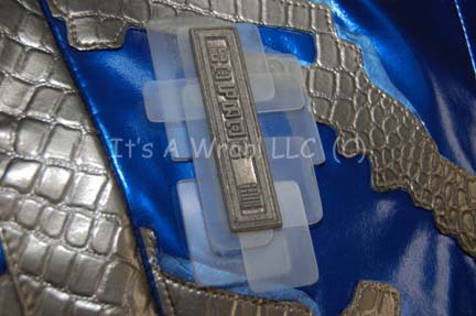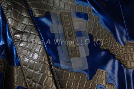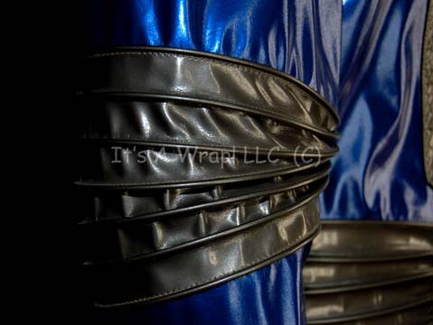 Description: A costume featured in the Star Trek: Voyager episode “Drive”; wherein “Tom Paris” (Robert Duncan McNeill) enters the new Delta Flyer in the “Antarian Trans-Stellar Rally”. This costume consists of a long-sleeved, full-length, soft, blue vinyl jumpsuit featuring a gray vinyl, oversized collar, further gray, vinyl accents with a faux reptile scale texture across the front and back. The elbows and waist have reinforced, gray vinyl ribbing, and on the left breast is a multi-layered badge made from brushed acrylic rectangles of various sizes stacked into a geometric pattern. Attached on top is a cast-resin, silver-colored, bar with alien, iconographic symbols. An original “Muto Little” costuming tag is present as is a sewn in tag that reads simply “Patrick”, in addition to a costumer’s tag that reads ‘Voyager #249 Drive, Assan, Patrick Kilpatrick’.