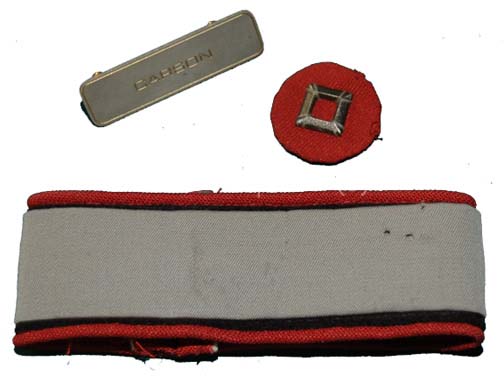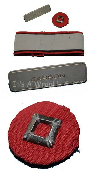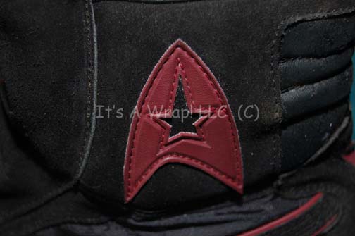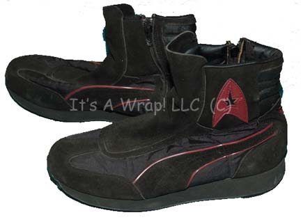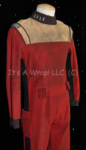 Description: A distressed crewman’s uniform believed to have been featured in the Interplay video game “Starfleet Academy” for wear by Julianna Robinson in her portrayal of “Vanda M'Giia”. The costume is a feature style crewman’s uniform jumpsuit with these attached elements, a pair of operations gray division strips on the shoulders, and four silver colored metal commendation bars placed on the right neck of the black ribbed collar. The costume also comes with these unattached items, a pair of black shoes with Starfleet emblem logos affixed, a division strip for the left sleeve forearm, a red placement with a silver colored rank badge indicating the wearer to be an ‘able seaman’, and a metallic silver pin backed badge with the name ‘CARSON’ etched into it. The costume is distressed in that the left sleeve cuff is thrashed and the right sleeve cuff is ‘melted’, and the costume fabric is generally dulled to appear ‘scorched’. The shoes are fragile due to time and storage conditions, they have become tough and brittle.