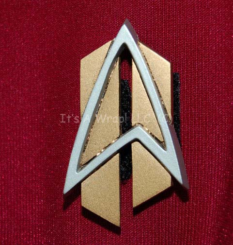Description: A costume featured in the Star Trek: Voyager finale episode “Endgame”. This costume is a “future” Starfleet uniform jumpsuit consisting of a long-sleeved, full-length jumpsuit with black trousers and a Command Red top featuring a raised, black stripe across the chest, and a Velcro patch for a future Starfleet-style commbadge (not included). A sewn in Voyager tag reads ‘Yvette Callum’.