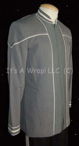 Description: A costume featured in the opening sequences of Star Trek: Nemesis and worn by one the musicians playing at the wedding of “Commander Riker” (Jonathan Frakes) and “Deanna Troi” (Marina Sirtis). This costume is a long-sleeved, gray uniform jacket featuring stitched accents down the front, vertical and horizontal white piping, more pronounced around the collar and cuffs; a zip down the front and black, overall-style trousers with gray and white, raised stripes down the legs. A sewn in tag of the style used in Insurrection and Nemesis reads ‘David Senescu, 11-01, Band, 38’ and a costumer’s tag reads merely ‘David Semescu, musician, 9 ½’.