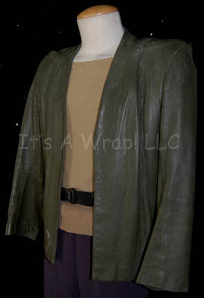 Description: A lot of civilian wear featured in Star Trek IX: Insurrection for wear by Patrick Stewart in his portrayal of “Captain Picard”. The lot consists of a set of dark mauve trousers with a blank white label sewn into the inside rear seam, a trio of two tone tan and olive colored micro suede, short sleeved shirts with one ‘Bill Hargate Costumes’ original manufacturers tag sewn into each; two of the tags are inscribed, one is illegible, one reads ‘#1 Hero’, and a green leather jacket with an asymmetrical front, an inside pocket in its green lining, and a piece of two sided adhesive tape inside, and a black leather belt with a label inscribed ‘Picard’. The jacket features a degree of strategically placed distress to appear ‘scored’ by falling debris. The distress is evident in scratches along the back around the shoulders, along the hem of the back, a white swath on the right jacket front, and is generally dusty from production use, the shirts and the trousers are in fine condition. The costumer’s tag reads ‘Sc- 222-240, dirty / from cave / in, Picard’. An excellent piece, this represents the last of the available ‘Picard’ Insurrection-style civilian costumes in the collection.