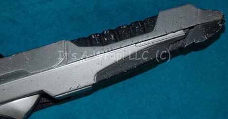 Description: STAR TREK VIII: “STARFLEET TYPE III MARK II PHASER RIFLE” – DAMAGED A molded resin Starfleet Type III Mark II phaser rifle featured in Star Trek VIII: First Contact. The item is black with metallic silver paint, an acrylic ‘targeting sight’ and a black nylon strap fixed in a static position. The item is missing two side accents under the ‘scope’ and depicts a visible degree of damage on the right side, there exists a significant number of scrapes that have etched into the resin itself in addition to lesser scrapes that have marred only the paint. The item depicts a variety of dings and scrapes on many raised edges generally, the left side of the item (with the strap) is significantly less damaged; as a show piece, this would be the side to display. The item measures approx. 33.5 X 9.5 X 2 inches.