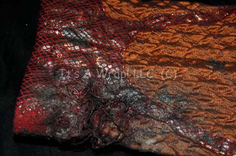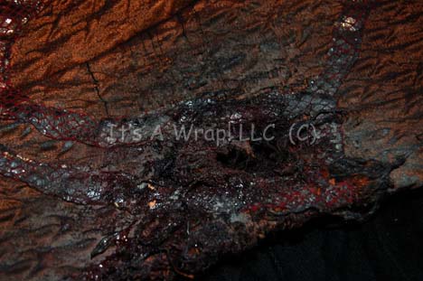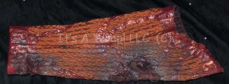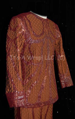 Description: A costume featured in the Star Trek: Voyager episode “Flesh and Blood: PART I”; wherein “Voyager” answers a distress call from a Hirogen base that has been utterly decimated by the holograms from the holodeck technology that “Captain Janeway” (Kate Mulgrew) gave them. This costume is a long-sleeved, metallic-copper tunic featuring a textured arrow design and iridescent brown, vinyl accents in a red-bordered, diamond pattern; corresponding overall-style trousers and an extra tunic sleeve that has been distressed to emulate the wound that the character had when “Voyager” found him. A sewn in Voyager tag reads Ryan Bollman’ and a costumer’s tag reads ‘Voyager #253 Flesh and Blood pt 1, Donik, Ryan Bollman’.