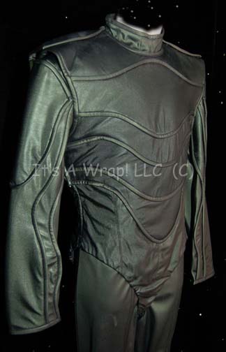 Description: A costume featured in the Star Trek: Enterprise episode “Awakening”, wherein “Captain Archer” (Scott Bakula) and “T'Pol” (Jolene Blalock) encounter a renegade group of Vulcans responsible for the bombing of the Earth Embassy on Vulcan. This costume is a full-length, long-sleeved jumpsuit that is mostly green vinyl but, along the abdomen, is a black spandex-like material, along the sleeves and around the knees the vinyl is reinforced and takes on a textured appearance; there is a zip up the back and stirrups for the feet. Also included is a breastplate of the same reinforced, green vinyl and textured appearance, but also a horizontal ribbed design, buttons and a zip along the left shoulder, a clasp connection between the legs, and matching vinyl gloves. A very fine layer if dirt remains upon the item from production, a sewn in Enterprise tag reads ‘Jeff Wolfe #84’ and a costumer’s tag denotes the same.