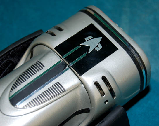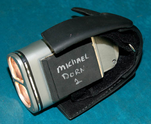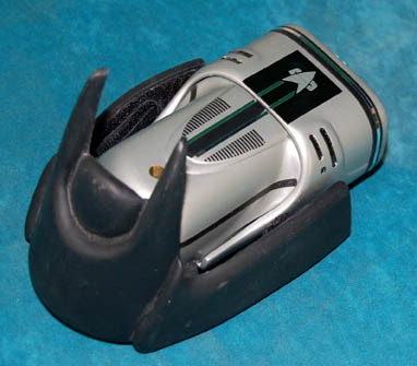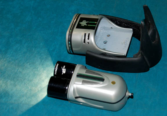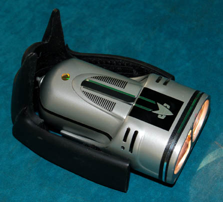 Description: A feature film Starfleet wrist lamp made for wear by “Worf” (Michael Dorn) during the filming of Star Trek feature films. The lamp case is made of resin with light filters in the front and numerous black and silver applications for detail including a Starfleet emblem. The foam pad on the underside of the case reads, “Michael Dorn 1”. The black Velcro adjustable wrist strap is made of rubber and reads, “Male 1”. Two incased Surefire lamps slot into the casing of which there is only one of two screws remaining to hold them in place. The one screw however still keeps the piece together nicely. The lamp is powered by six CR123A batteries (not included). The battery configuration is a little complicated but a diagram is included to make it easier. Measures approx. 7 x 4 x 2 ½ inches.