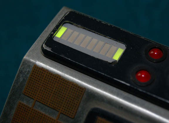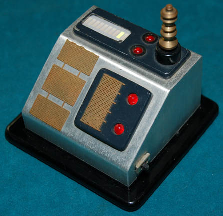 Description: An electronic scrambling device component featured in the Star Trek: Voyager episode, “Threshold” in which “Captain Janeway” (Kate Mulgrew) and “Tom Paris” (Robert McNeill) were transformed into Transwarp Humans. The device is made of brushed aluminum on a black acrylic base with black acrylic accents and gold colored metal detail. A small switch on the side activates four red flashing LED lights and a bar of scrolling green lights. The device is powered by a standard 9V battery (not included) that is accessed by unscrewing the base with an Allen wrench (Hex Key). Measures approx. 3 ¼ x 3 ¼ x 3 ¼ inches.