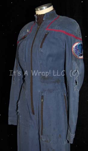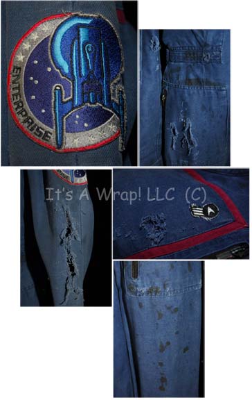 Description: A distressed Starfleet uniform jumpsuit featured in various episodes of Star Trek: Enterprise. The costume is a blue jumpsuit with engineering red division stripes around the shoulder, multiple zippered pockets and Velcro size adjusting cuffs at the ankles and wrists. The item features the famous “Enterprise NX-01” assignment patch on the left shoulder and a rank patch on the right breast indicating the wearer to be a ‘crewman first class’. The costume includes a sleeveless black button front undershirt and depicts significant distress. The distress is evident in that tears, rips, and general thrashing are visible throughout. Holes exist in the pockets on the thighs, a tear is in the left sleeve, holes are present at the intersection of the division trim, stains are evident generally around the costume. A sewn in Enterprise tag indicates wear by various actors. A costumer’s tag indicates ‘distressed’.