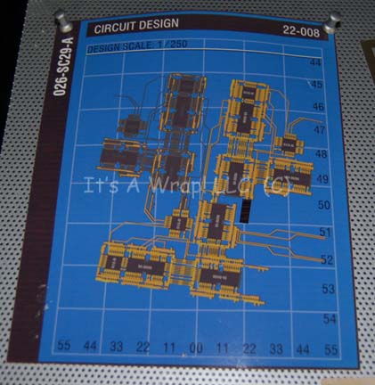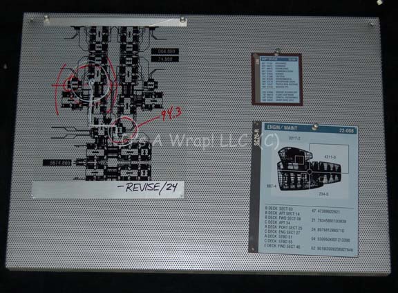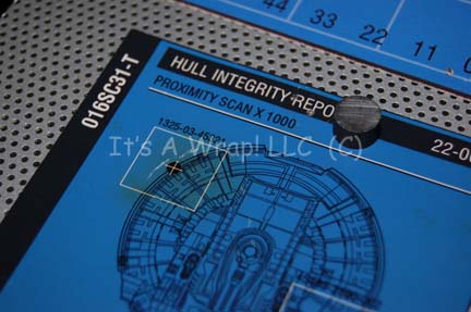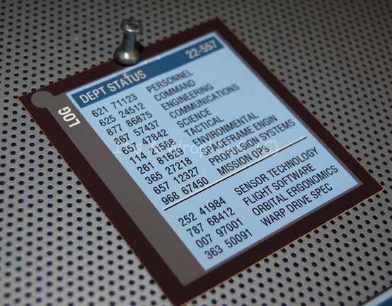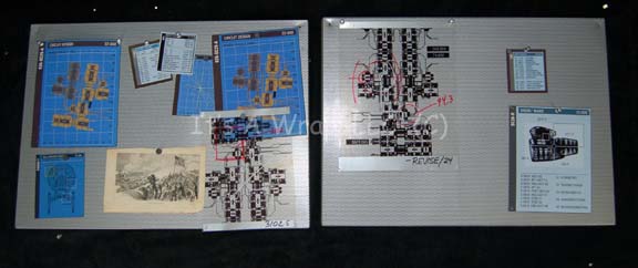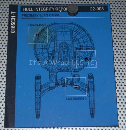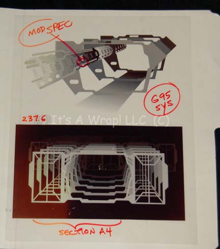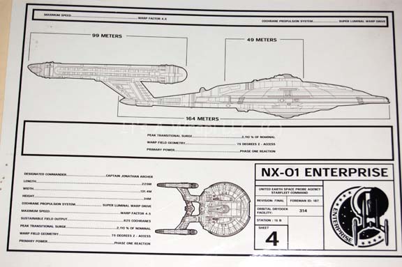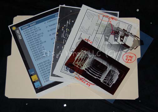 Description: A set dressing item appearing in various episodes of Star Trek: Enterprise in the crew quarters set of “Commander ‘Trip’ Tucker” (Connor Trinneer). The lot is a pair of polished silver colored metal covered bulletin boards with the ‘paperwork’ that was pinned on them. The paperwork is comprised of items that were located with the bulletin boards and verified in set continuity guides. One board is adorned with a translucent sheet that features a schematic of circuitry in black and hand written marker strokes in red and white, an ‘ENGIN/MAINT’ schematic on photo quality paper and a ‘DEPT STATUS’ log report indicating the title of various departments on the ship. The second set of ‘printouts’ are comprised of an ‘OPS DUTY ASSGN’ sheet and an ‘ACTIVITY REPORT’, a printout reading ‘INPUT MODE’ that features a schematic, a ‘HULL INTEGRITY REPORT’ that features a dorsal schematic of the “Enterprise NX-01”, a circuit design schematic, and a printout of the ‘Battle of New Orleans’ on paper taken from an etching with a lively depiction of American troops battling the British from a set of earthworks. Another set of 8.5 X 11 inch items are present which were not depicted in the continuity guides comprised of a printout of a star chart in black with radiating positions showing the location of stars in the galaxy and of some well known locations including ‘Wolf-359’, ‘P’Jem’, ‘Terra Nova’, ‘Andoria’ and ‘Vulcan’; a translucent rendering of what may be a nacelle housing, an ‘ENGIN/ MAINT’ report deck by deck, and an engineering schematic of the “Enterprise NX-01” complete with a graphic of the assignment logo for the ship, and capabilities of the ship itself under normal operating parameters. The paperwork features pin holes and a degree of warping and bends due to set use, they were located in a folder reading ‘Trips Quarters’. The bulletin boards measure approx. 15 X 21 X 0.75 inches with screw holes for wall mounting.