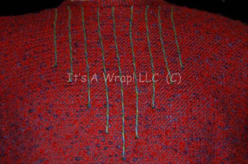 Description: A costume item similar to those featured in various episodes of Star Trek: Voyager as worn by Martha Hackett in the role of the Cardassian turned Bajoran turned Kazon consort “Seska”; this shirt is a long-sleeved, red and lavender boucle wool sweater featuring multi-colored, textured, vertical stripes down the front, back and sleeve cuffs, a black and lavender inset along the bottom and a zip down the back. A sewn in Voyager reads ‘Martha Hackett’.
