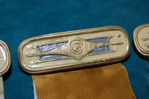 Description: A lot of wire backed cast resin Starfleet Academy ribbon badges featured in the Star Trek: Starfleet Academy personal computer game released in 1997. The items are nearly identical to the resin bars featured as backing for Starfleet emblem badges worn by officers in Star Trek feature films painted gold, off-white, and gray, they feature adhered wire backings and colored ribbon fabric. The ribbons represented in this lot are colored green, silver, white, and gold; the gold ribbon also features a second white fabric backing.