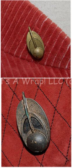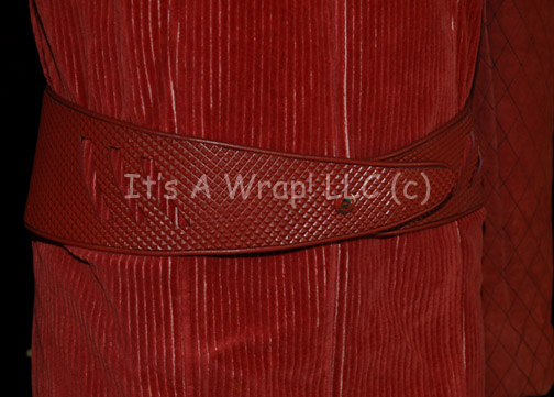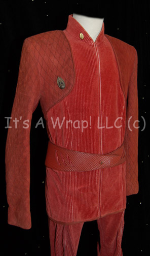 Description: A costume featured in various episodes of Star Trek: Deep Space Nine. This costume is a Bajoran Militia uniform consisting of a long-sleeved, rust-colored jacket featuring a textured, vertical, striped pattern, darker colored sleeves with a black-stitched diamond design, a Velcro patch for a commbadge (included but not attached), a metal earring that attaches via a clasp, pin denoting the rank of Major, overall-style trousers that match the striped pattern of the jacket, a red, plastic belt with a textured diamond pattern, and corresponding reddish leather boots featuring rubber accents of the same diamond motif . A sewn in Deep Space Nine tag in both the jacket and trousers reads ‘Andy De Palma’, a label in the boots reads the same as does the costumer’s tag.