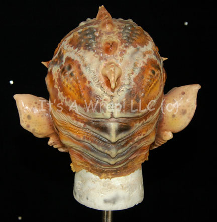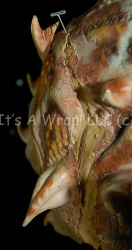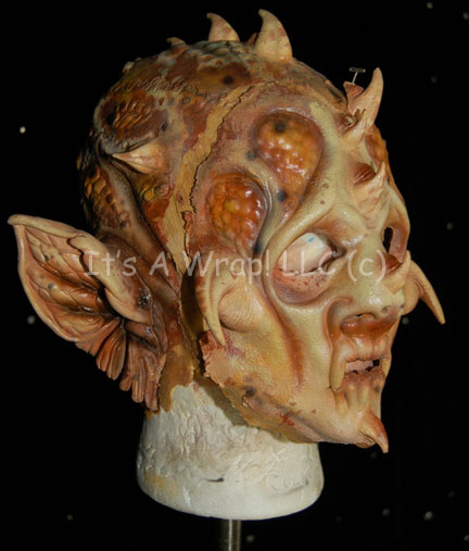 Description: An alien special effects make-up mask believed to have been featured in the Star Trek: Enterprise episode “Rajiin” and altered for later use. The mask consists of a full head wrap and a removable face application with cut out eyes and mouth. The mask has large ears and horns believed to have been added on for later use and painted to match. The lifelike alien flesh tone is brown and tan themed, the mask itself is soft and flexible. Only around the edges is there any evidence of drying or cracking. One horn for the forehead of the mask is separate but accompanying.