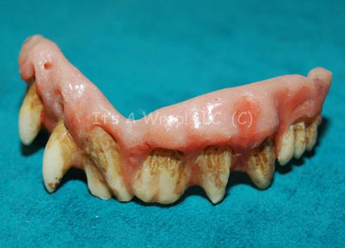 Description: A set of special effects teeth created for use in the Star Trek: Enterprise episode “The Expanse” by ‘L. Sidney’ in his portrayal of a Klingon helmsman on “Duras’” Bird-of-Prey. The item is a set of pink gums and gnarly looking teeth, discolored to fit the theme of Klingon characters, it is one set for the upper row in the mouth and presumably fit to conform to the actor only. The item is stored in a plastic container with a twist off cap labeled ‘L. Sidney, Klingon Crewman’.