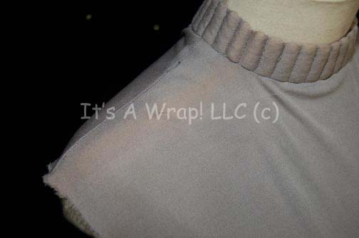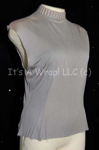 Description: A costume item featured in various Star Trek feature films. This item is a sleeveless, Starfleet uniform undershirt in Operations gray with a ribbed collar and zip down the back. A costumer’s tag reads ‘Uhura, N. Nichols’.