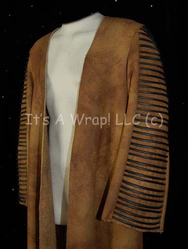 Description: A costume featured in the Star Trek: Enterprise episode “Affliction” whereas “Dr. Phlox” (John Billingsley) is kidnapped by Klingons to find a cure for a mutagenic virus that could kill millions. This item is a long-sleeved, full-length, brown suede robe featuring black, raised leather piping along the shoulders and down the sleeves.