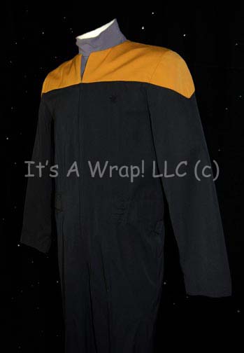 Description: A costume featured in various episodes of Star Trek: Voyager. This costume is that of “Ensign Vorik” (Alexander Enberg), a Starfleet engineer who worked in main engineering; it consists of a black, Starfleet uniform jumpsuit featuring Operations Gold division shoulders that zips up the front and clasps above the zip; a Velcro patch on the left breast for a Starfleet ‘commbadge’ (sold separately), and form-fitting black elastic around the waist with sewn in loops for ‘away team’ gear. The costume comes with a gray turtleneck undershirt that zips up the back. A sewn in Voyager tag in the jumpsuit reads ‘Alexander Enberg’, another that reads ’40-#177’, a matching tag denoting the same size in the undershirt, and a fourth blank Voyager sewn in tag.