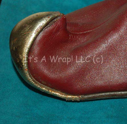 Description: A pair of plum colored Vulcan themed boots believed to have appeared in Star Trek III: The Search for Spock. The boots are of similar design to the costumes of the ceremonial guards in the Fal-Tor-Pan sequence and feature large sewn on ‘gem’ stone accents made from translucent resin on the front of the shin just under the knee. The boots feature gold colored upturned toes and are made for male wearers as size 11.5.