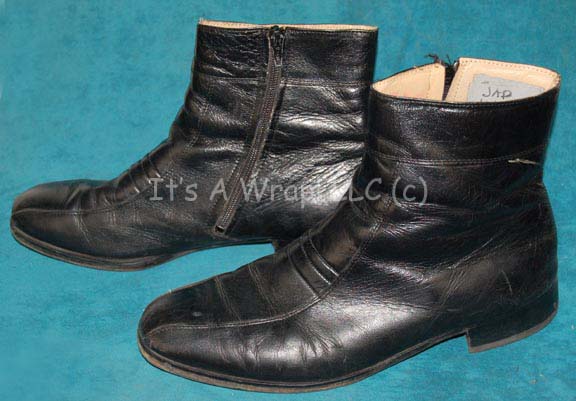 Description: A pair of black leather men’s boots appearing variously in Star Trek episodic television and/or feature films and are compatible with generally any Starfleet uniform. The boots are used Giorgia Brutini ‘G-Rock’ name brand footwear. The items are black leather exteriors with tan inner linings and feature black elastic bracings on the inside and outside ankles. The items are inscribed ‘9 ½’ and are intended for male wearers. This pair is in exceptional condition.