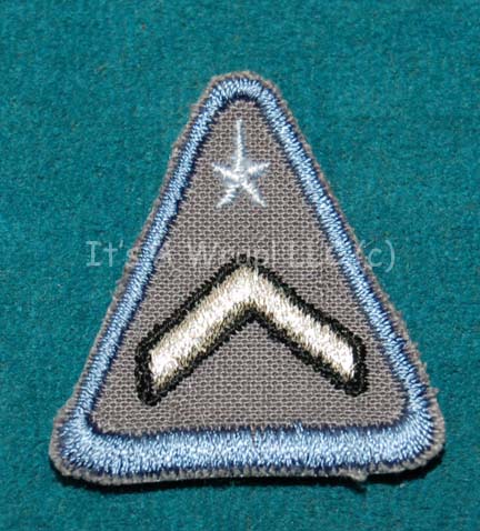 Description: A MACO (Military Assault Command Operations) rank patch created for use in various episodes of Star Trek: Enterprise. The item is a triangular patch colored blue with a white star and a single white chevron indicating the wearer to be a ‘private'. This item would be worn on right sleeve of a uniform top.