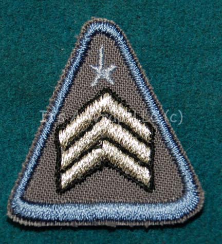 Description: A MACO (Military Assault Command Operations) rank patch created for use in various episodes of Star Trek: Enterprise. The item is a triangular patch colored blue with a white star and three white chevrons indicating the wearer to be a ‘sergeant'. This item would be worn on right sleeve of a uniform top.