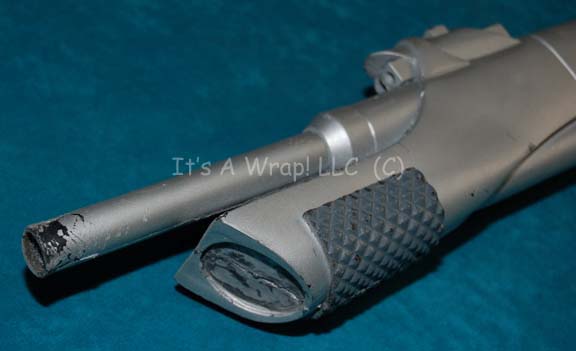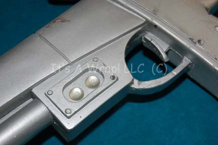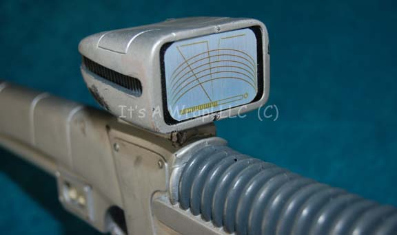 Description: A prop Vulcan rifle featured in the Star Trek: Enterprise episode “Shadows of P’Jem”. The item is molded foam rubber painted metallic silver with gray painted grip elements, a pair of shoulder strap loops, no actual strap is present. The ‘targeting scope’ features a metallic silver adhesive graphic readout that the item depicts a degree of scuffing due to use or storage conditions. Measures approx. 29 X 8.5 X 2.5 inches.