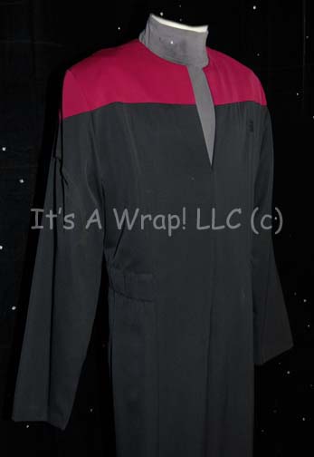 Description: A costume featured in various episodes of the first season of Star Trek: Deep Space Nine. This Starfleet uniform jumpsuit is black with red command division shoulders that zips up the front and clasps at the top, half way up the chest, and features a Velcro patch on the left breast for a Starfleet ‘commbadge’ (sold separately). The waist features form fitting black elastic with sewn in loops for ‘away team’ gear, the feet end in black elastic stirrups. The costume comes with a gray turtleneck undershirt, in the Maquis-style, that zips up the back. Both items feature a sewn in Deep Space Nine tag that read ‘Avery Brooks’ and a costumer’s tag that reads ‘DS9, Avery Brooks, Sisko, 1st Season’.