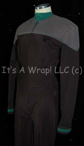 Description: A Starfleet uniform jumpsuit featured in multiple episodes of Star Trek: Deep Space Nine for wear by Terry Farrell in her performance as “Jadzia Dax”. The costume is a black form fitting jumpsuit with gray quilted shoulders and sciences blue division strips on the sleeve cuffs, with ‘away team’ gear loops sewn into the waist, and a sleeveless blue sciences division undershirt with a zip front and negligee. Both garments feature sewn in Deep Space Nine tags reading ‘Terry Farrell’ and the costumer’s tags read ‘DS9 Dax’, one reads ‘Terry Farrell’ and is stamped ‘DS9’.