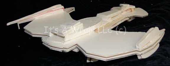 Description: A white foam core test model of a Klingon Negh’Var class starship created for the Star Trek: The Next Generation Episode “All Good Things…” The item is made form multiple layers of adhered together foam core cut to specific shapes for camera tests and scale representations of flyby sequences. The item features a damaged area on the dorsal center where a mounting arm was removed, and red marker lines on the ventral side for cutting the item into shape. The item is inscribed ‘Future Klingon “Negh’Var”’. Due to time and storage conditions the item has seen a visible degree of wear and moderate damage. Some elements are completely broken off, yet the item retains its overall resemblance to the intended starship. Measures approx. 24 X 29.5 X 7 inches.