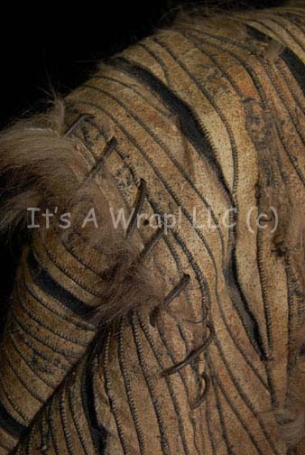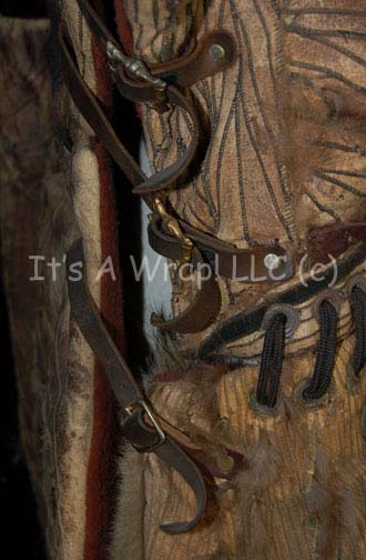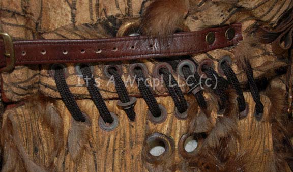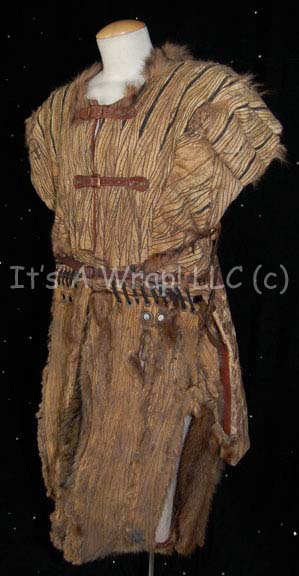 Description: A costume similar to those featured throughout Star Trek: Enterprise. This costume consists of a sleeveless robe featuring a yellowed, distressed fabric, tied together with black laces and heavy brown straps fed into metal buckles; irregular, black striping, faux fur accents, and two further brown strap/buckle combinations down the front. A pinned in Enterprise tag reads ‘Al Burke’.