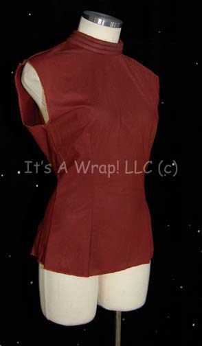 Description: A rust colored costume shirt believed to have been created as an alternative to items that appeared on screen. The item is a sleeveless shirt with a metal zip spine and horizontally ribbed collar.