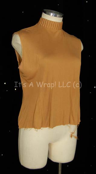 Description: A tan colored sleeveless undershirt created for use in Star Trek feature films. The item is sleeveless and features a metal zip up the spine. A sewn in Paramount tag reads ‘Size 10’.