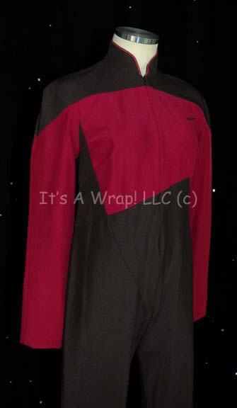 Description: A Starfleet uniform made in the style of Star Trek: The Next Generation and reused in the seventh Star Trek feature film “Generations”, it features the black shoulders with a Command Red chest, back, and sleeves; a black waist and legs that end in stirrups. This style also exhibits the Mandarin collar common to cast members during and after the third season which features red piping along the top of the collar. This particular uniform has zip down the front and features a Velcro patch on the left breast for a commbadge (sold separately). A sewn in Star Trek: TNG tag reads ’36, #306’, and a Star Trek: VII tag that reads ‘Pat Tallman’.