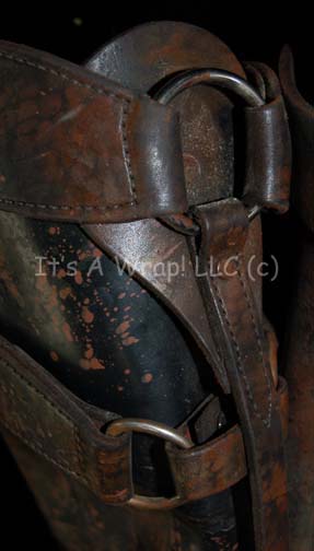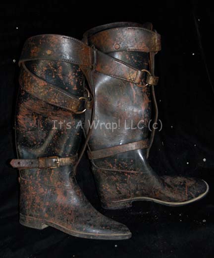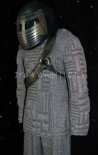 Description: A costume featured in the Star Trek: Voyager episode “Alliances” and then later in the Enterprise episode “Damage”. This costume consists of a long-sleeved, dark-gray jacket featuring a design of multiple, quilted rectangular shapes in multiple sizes, matching overall-style trousers of the same color but without the quilted texture, brown leather, knee-high boots; a leather and metal bandolier, and a black, plastic helmet with a clear facemask added for when the costume was used for the “Mokra” in the Voyager episode “Resistance”. The jacket and trousers both feature sewn in Enterprise tags that read ‘Jeff Smolek, #071’, the bandolier has a label that reads ‘mickey cassiday’, the boots are labeled ‘Bill Blair’, the helmet ‘Irving Lewis’, and a costumer’s tag that reads ‘Voyager, 131 Alliances, Pommar’.