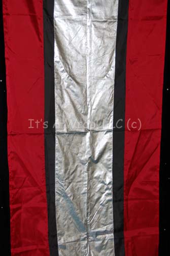 Description: A piece of set dressing similar to those featured in various episodes of Star Trek episodic television. This item is a large red flag with a central, metallic-silver stripe bordered by black travelling the length of it. The item is suitable for hanging and measures approx. 96 X 36 inches.