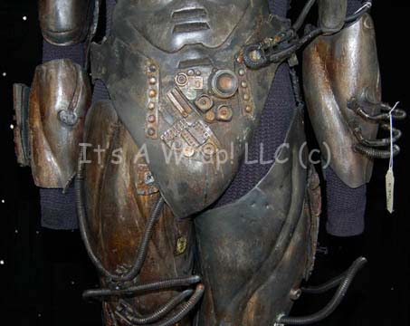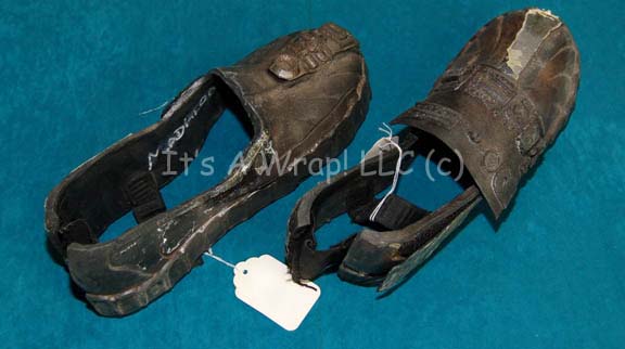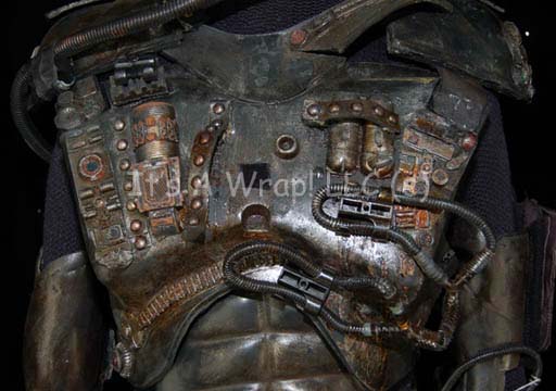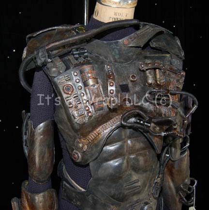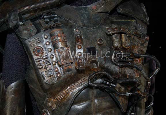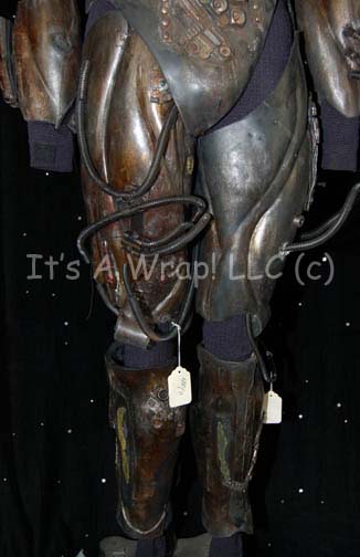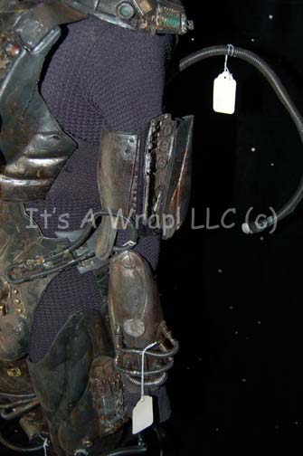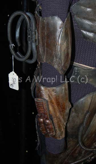 Description: A Borg drone costume featured in the Star Trek: The Next Generation episode “Descent, Parts I and II”. The costume is a form fitting jumpsuit with multiple molded black rubber ‘body armor’ components that feature various Velcro connections and attachments with plastic tubing. The jumpsuit is a black thermal-underwear styled affair with attached feet, a zip up the spine, and a zippered inseam, perfect for affixing all of the molded features with heavy duty Velcro placements. The molded rubber ‘exo-plating’ armor is composed of items that wrap around the body and fasten through either belt or Velcro placements with multiple molded rubber raised accents to suggest technology. They comprise a wraparound for the thighs and shins, biceps and forearms, a torso covering that the wearer steps into and fastens by way of belt with Velcro, a chest armor piece, an abdomen armor piece, a set of shoulder plates, a set of neck tubes, a pair of gloves, and a pair of spats. Multiple loose items were located with the costume, several are Velcro backed for attachment to corresponding pieces that fill space and allow the armor to appear more covering. The costume pieces are labeled ‘Tafoya’ and a sewn in Star Trek TNG tag in the thermal jumpsuit is inscribed ‘Mr. A. Tafoya’. A second tag reads ‘Steve Lambert’. Adrian Tafoya is a recurring Star Trek background actor, Steve Lambert is a veteran Star Trek Stunt actor, and there is no indication as to when he performed in this under suit.