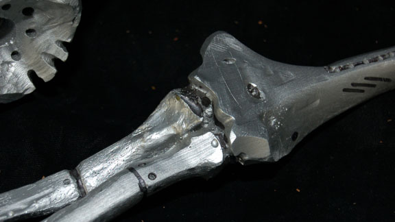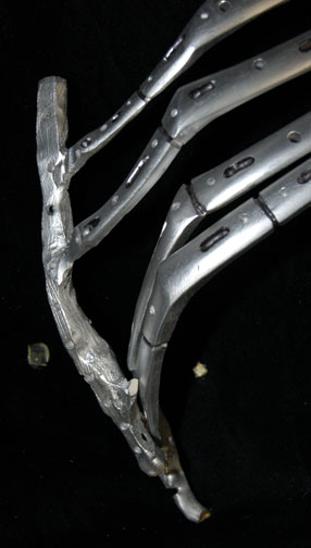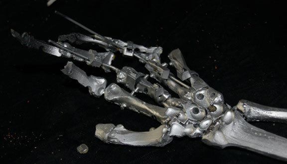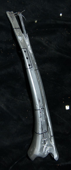 Description: A lot of Borg ‘bones’ featured in Star Trek VIII: First Contact for use in scenes taking place during the dénouement of the film in Engineering. The items are molded resin ‘bones’ painted metallic silver with black adhesive detail lining for a ‘constructed’ appearance, with black nylon cord and metal spring to emulate ‘wiring’. The items represent a femur leg bone, an arm bone from humerus to fingertips, a pelvic bone perforated with small holes, part of the rib cage, and an almost complete foot. The items are distressed to appear ‘savaged’ and ‘torn apart’. The hand doesn’t have all of its fingers. The arm measures approx. 16 inches, the foot 9 X 3 inches, the femur 12 inches long, and the pelvis measures approx. 10 X 10 X 6 inches.