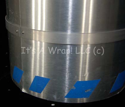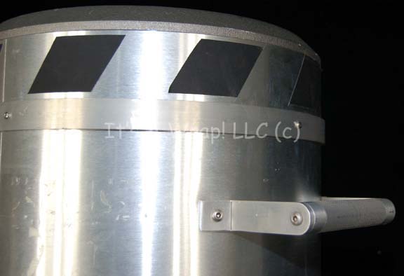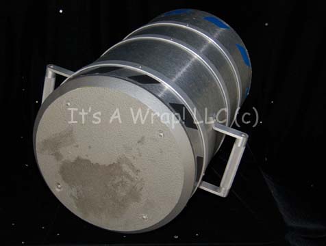 Description: A piece of set dressing that was featured in the Star Trek: Enterprise episode “Dead Stop” and modified for use as set dressing in various episodes. This item is a large wooden barrel, painted silver, with matching, metal handles and a lid screwed on, metal trim around the circumference, blue jagged lines on the bottom and black on the top. The item has minor staining on the lid and distress; it has an approx. height of 25 inches and an approx. diameter of 19 inches.